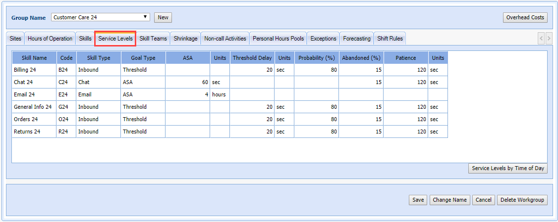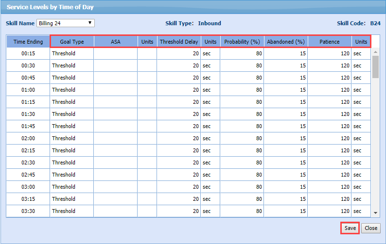 - Set the Goals Type, ASA, Threshold Delay, Probability, Abandoned, and Patience for specific interval(s) by clicking in the field, and typing the change.