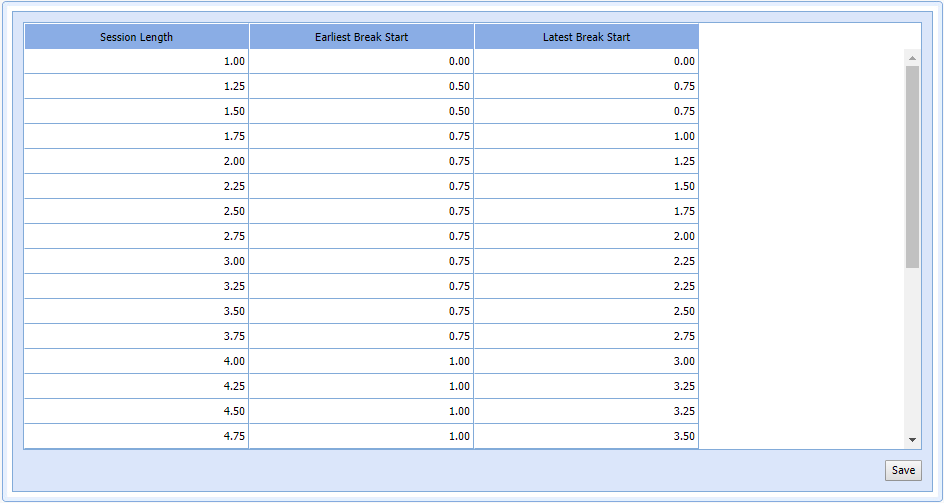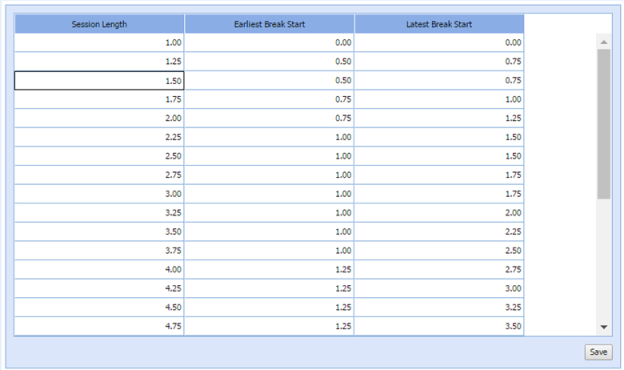 For example: In the table above for a session length of 4.00 (an 8-hour shift), the break will be placed no earlier than 1.25 hours from the start of the session, and no later than 2.75 hours from the start of the session.