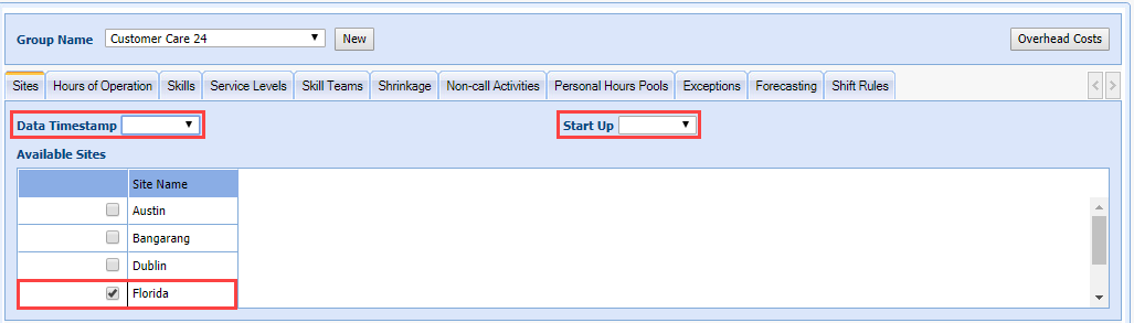 - Set one of the sites as the Data Timestamp, and one as the Start Up from the drop-down menus.