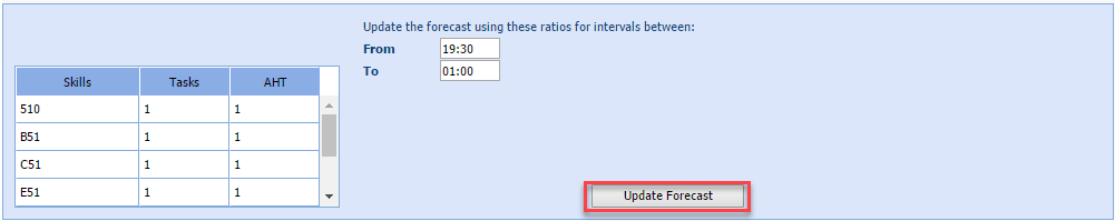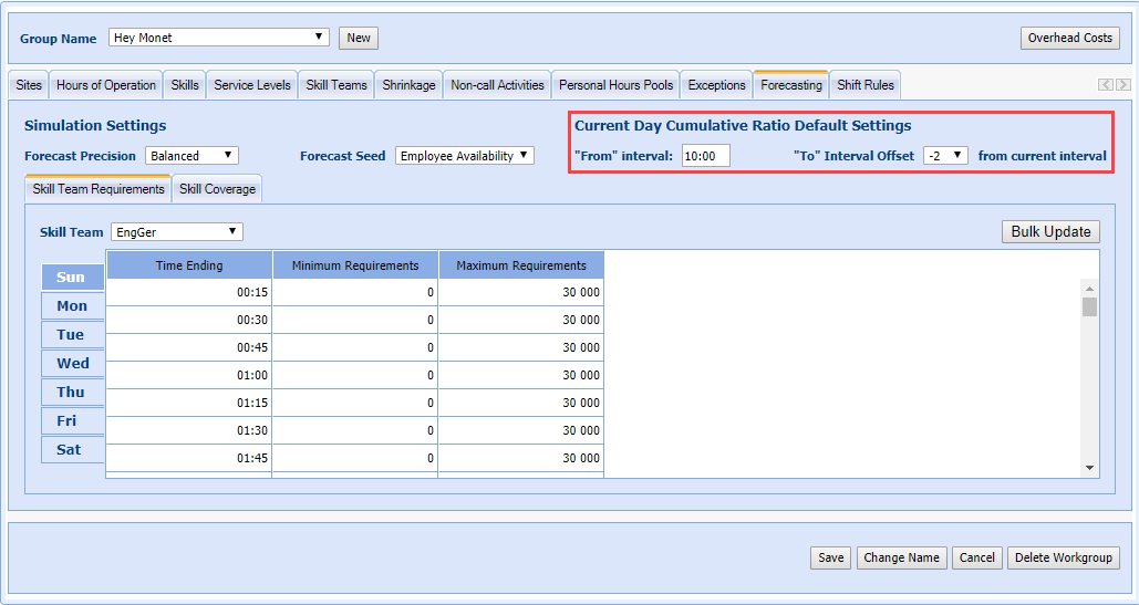 The cumulative ratio for the current day is calculated automatically using the From and To settings in the Workgroup Setup > Forecasting > Set the Current Day Cumulative Ratio Default Settings.